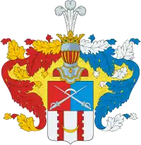 Щит увенчан дворянским шлемом и короной с тремя страусовыми перьями. Намёт на щите красный и голубой, подложенный золотом.