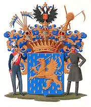 Описание герба: Выдержка из Общего гербовника В лазуревом, усеянном, золотым пламенем, щите, такой же, с червлеными глазами и языком Гриф, держащий золотой меч и такую же косу. Щит увенчан Графскою короною и тремя графскими коронованными шлемами. Нашлемники: средний – возникающий Императорский Орел, имеющий на груди червленый, с золотою каймою, щит, с вензелевым изображением Имени Императора Николая Iго. Второй – шесть значков, пересеченных серебром и лазурью, с золотыми древками. Третий – золотой сноп, за которыми на крест положены такие же меч и коса. Наметы: лазуревые с золотом. Щитодержатели: Улан Чугуевского полка и пехотный солдат. |