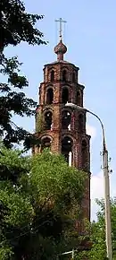 Через полвека после храма была возведена стройная ярусная колокольня — одна из самых примечательных среди множества колоколен Ярославля.[2] Будучи почти вдвое выше самого храма, она придавала приходу живописный вид. Колокольня принадлежит к характерному для последних лет XVII века типу ярусной звонницы.[3] Нижняя часть — высокий глухой «восьмерик на четверике», над ним надстроены ярус звонов и три яруса постепенно уменьшающихся открытых аркад, которые увенчаны нарочито малой главкой. Столь сложное построение колокольни призвано зрительно увеличивать её высоту.[2]
