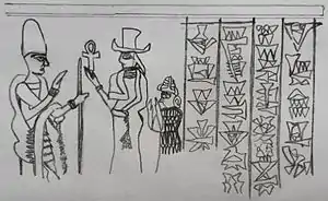 ![]() Царская печать Никмепы I. Царь изображён в короне, окружённый двумя богинями, одна из которых носит сирийское платье, а другая вавилонское. | |