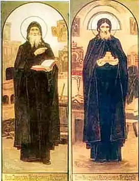 ![]() Преподобные Никодим и Спиридон Печерские (икона XIX века) | |