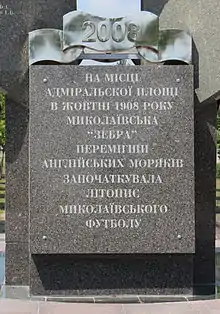 Команда «Зебра» является участницей первого футбольного матча, проходившего на территории Николаевской области. Матч состоялся в октябре 1908 года, и именно с эта дата является официально принятой датой рождения футбола на николаевщине. В 2008 году к столетию местного футбола и в память об историческом матче в городе Николаеве был сооружён монумент с памятной табличкой.