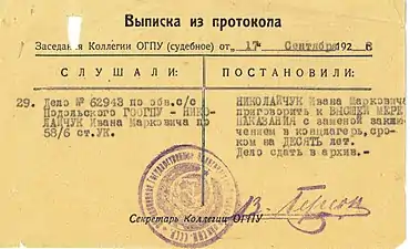 Помог Григорий Петровский, который был знаком с Николайчуком по якутской ссылке, и к которому сумела пробиться в Харькове Марфа Петровна. Петровский был тогда «всеукраинским старостой», председателем Всеукраинского ЦИК. При его содействии жене было разрешено даже свидание с Иваном Марковичем в тюрьме ОГПУ в Харькове, на Холодной горе. По окончании следствия по делу Гайсинской контрреволюционной организации Николайчук был приговорён к расстрелу с заменой 10 лет концлагерей и пожизненной высылке с поражением в правах. По сведениям семьи срок он отбывал на Соловецких островах