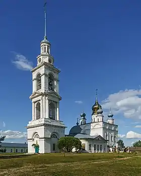 - Крестовоздвиженский собор (1679; древнерусская архитектура, классицизм) — храм с трапезной и колокольней (1832—1835). Складывался на протяжении полутора столетий. Самая ранняя его часть — двустолпный храм 1679 года, выдержанный в несколько архаизированных формах, что выражено в преобладании глухого и гладкого массива стены, в трактовке фасадов, простоте их членений и сдержанности декора. Высокий кубообразный двусветный четверик под четырехскатной кровлей несёт пять крупных цилиндрических барабанов, по сторонам света прорезанных узкими щелевидными проёмами. Храм имеет луковичные главы. Имеются три сильно пониженные, вытянутые в плане апсиды, одновременные основному объёму и равные ему по ширине. В 1832—1835 годах построены трапезная и колокольня. Выполнены в стиле классицизма. Немного более широкая, чем храм, низкая трапезная со скругленными углами увенчана в центре большим полусферическим куполом. Через притвор к ней примыкает пятиярусная колокольня, доминирующая в композиции храма. По сторонам колокольни в XX веке сделаны пристройки, не сохранились.