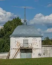 - Водяные ворота с башней-часовней (1786—1787; классицизм, барокко). Пример редкого в области типа сооружений последней четверти XVIII века. Прямоугольный двухъярусный башнеобразный объём с крупным арочным проездом в нижнем уровне и часовней в верхнем завершён четырехскатной выпуклой барочной кровлей и шпилем.