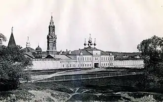 Кроме небольшой звонницы, пристроенной к западной части главного монастырского храма Успения Пресвятой Богородицы, ещё западнее выстроена отдельно стоящая 40-метровая колокольня 1876—1879 годов постройки[10]. Колокольня, выполненная в готическом стиле, построена на средства благотворителей, главным образом Алексея Ивановича Хлудова и Ивана Васильевича Носова[13], архитектор Горностаев Ф. Ф.[14].