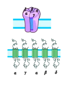 Высокая концентрация никотиновых ацетилхолиновых рецепторов в электрических органах некоторых скатов, в частности у калифорнийского гнюса и мраморного электрического ската, вместе с выделением α-бунгаротоксина (αBGT — полипептида из яда южнокитайского многополосого крайта, который является необратимым лигандом и специфическим антагонистом ацетилхолина для никотиновых рецепторов в нервно-мышечных синапсах), позволила биохимически очистить и детально исследовать никотиновые ацетилхолиновые рецепторы, а также идентифицировать место связывания ацетилхолина. Было доказано, что данный рецептор является гетероолигомерным комплексом, состоящим из четырех разных белковых субъединиц, которые были названы соответственно их молекулярной массе (в килодальтонах): α (40), β (50), γ (60), δ (65). При естественной экспрессии в клетке сначала возникают димерные комплексы α-γ и α-δ, потом формируется тример α-β-δ, и наконец, после объединения димера и тримера, в клеточную мембрану встраивается функциональный пентамер со стехиометрией α2βγδ.