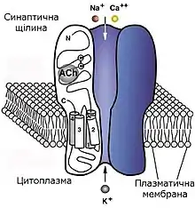 Трансмембранная часть рецептора образует ионный канал, стенки которого сформированы сегментами М2 всех пяти субъединиц. Было доказано, что относительно небольшие пертурбации, а именно поворот на 4° двух агонист-связывающих субъединиц, приводят к значительному смещению сегментов М2 и открытию поры ионного канала, что является условием возникновения катионного тока через рецептор.