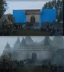 Съёмки сцен Риверрана начались в октябре 2015 года и привели к нескольким жалобам от местных жителей, живущих в этом районе, из-за строительства части замка Талли.[16] Съёмки сцен произошли в Корбете, графстве Даун, Северной Ирландии.[16] Из-за некоторых опасений по поводу размера здания, съёмки не могли состояться, пока местные инспекторы не смогли определить, следовала ли производственная команда тому, что было согласовано в разделе «планирование и применение».[16][17] Строительство замка началось в сентябре, к которому, вскоре после этого, добавили шатры и деревянные дополнения.[16] Кроме того, производственная команда также создала реально работающий подъёмный мост для сцен, чтобы не полагаться на CGI, для создания съёмочной площадки.[14] Визуальные эффекты были добавлены, чтобы создать остальную часть замка.[14]