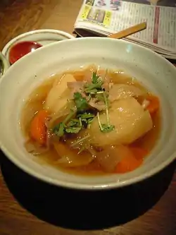 Никудзяга (яп. 肉じゃが) — блюдо японской кухни, представляющее собой мясо, тушённое вместе с картофелем и луком, приправленное сладким соевым соусом, иногда также с добавлением аморфофаллус коньяк и овощей[1]. Основу блюда составляет картофель, тогда как мясо, обычно добавляемое в не очень большом количестве, служит в первую очередь для придания блюду вкуса и аромата. Его обычно варят до тех пор, пока большая часть жидкости не выкипит. Наиболее распространённым мясом для никудзяга является тонко нарезанная говядина, хотя говяжий или иной фарш тоже периодически используется. В восточной Японии вместо говядины для приготовления блюда часто используется свинина. Никудзяга является традиционным «зимним» японским блюдом, часто приготавливаемым в домашних условиях и подаваемым вместе с миской белого риса и тарелкой супа мисосиру.