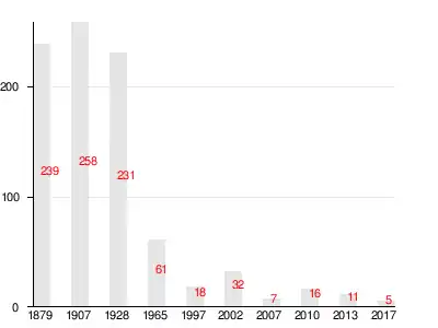 | 1879 | 1909[17] | 1928 | 1965 | 1997 | 2007[18] | 2010[19] |