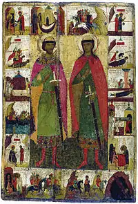 Согласно данным «Повести», новгородская дружина плыла по Вятке, и обнаружила на её высоком правом берегу хорошо укреплённое валом и рвом городище, населённое «чудью отяками». Местными жителями оно называлось «Болванский городок»[1]. Новгородцы решили взять это городище, и дали обет святым князьям Борису и Глебу (воинским покровителям), что не будут пить и есть, пока не возьмут город. В результате, 24 июля (по старому стилю) 1181 года город был взят. Часть его защитников была перебита, остальные вместе с жителями разбежались по лесам. На месте городища новгородцы основали новый город Никулицын, и первым делом построили там церковь в честь Святых Бориса и Глеба. Данная церковь с хранящейся там иконой этих святых всегда считались особенно важными для всей Вятской земли[2].