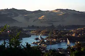 Нил течёт с юга на север. Характер течения Нила бурный, в нижнем течении спокойный. На реке расположено несколько островов: Агилкия, Биггех Гезира, Гезирет-ан-Набатат, Гезирет-Варрак-эль-Хадр, Замалек, Рода, Сехель, Саи, Гезирет-Тути, Филы и Элефантина.
