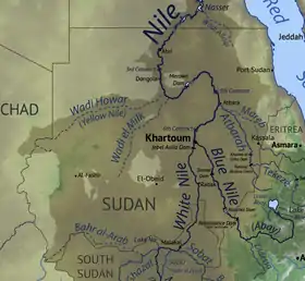 Ниже Собата река получает название Белый Нил (Бахр-эль-Абьяд), оставляет позади область болот и далее спокойно течёт в широкой долине по полупустынной местности до Хартума, где сливается с Голубым Нилом. Отсюда и до Средиземного моря река именуется Нил (Эль-Бахр). Голубой Нил значительно короче Белого, но в формировании режима Нила ниже Хартума он играет гораздо более важную роль. Голубой Нил берёт начало с Эфиопского нагорья, вытекая из озера Тана. С этого же нагорья Нил получает свой последний многоводный приток — Атбару.