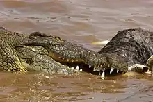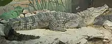 Ни́льский крокоди́л[1] (лат. Crocodylus niloticus) — крупное пресмыкающееся семейства настоящих крокодилов. Самый большой из трёх видов крокодилов, обитающих в Африке, и второй по величине в мире, после гребнистого крокодила[2][3][4]. Занимает верхнее положение в водных и околоводных экосистемах Африки. Взрослые особи способны справляться с такими крупными и сильными зверями, как черный носорог, гиппопотам, жираф, африканский буйвол, канна и лев. Кроме того, благодаря району обитания, размерам и силе, нильский крокодил печально известен как крокодил-людоед[5][6]. В древние времена являлся объектом страха и поклонения[7]. До настоящего времени остаётся, пожалуй, наиболее известным видом семейства настоящих крокодилов[8]. Численность этого вида относительно высока и стабильна, хотя популяции в отдельных странах находятся под угрозой исчезновения[9].