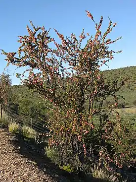 Вечнозелёный кустарник. Листья простые, линейные, блестящие, собраны в пучки. Цветки красные. Плод — жёлтая ягода[3].