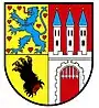 Щит разделён на золотое и червлёное поля; первое разделено на две части: в верхней части в окружении девяти червлёных сердец дикий, шагающий направо лазоревый лев с червлёным языком, в нижней — повёрнутая направо чёрная медвежья лапа с червлёными когтями; на другой части щита три остроконечных серебряных башни с лазоревой крышей, тремя окнами и золотым шариком каждая над стеной с пятью зубцами и открытыми воротами с серебряной падающей решёткой, арка которых украшена одиннадцатью зубцами.
