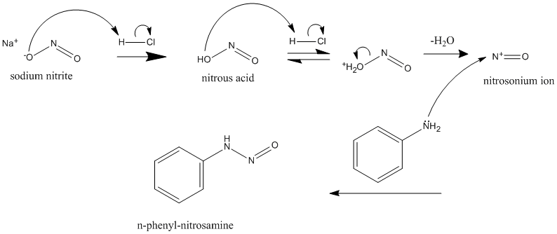 - Пример реакции получения нитрозаминов за счёт генерации иона нитрозония NO+ из нитрит-иона NO2-: