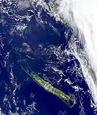Климат Новой Каледонии является тропическим, вмещающим два сезона: жаркий и влажный период с ноября по март с температурой от 27 °C до 30 °C[5] и более прохладный сухой период с июня по август с температурой от 20 °C до 23 °C[5], которые связаны двумя короткими промежутками.[6] Тропический климат сильно меняется под влиянием океана и пассатов, снижающих влажность, значение которой может быть близким к 80 %.[7] Среднегодовая температура составляет 23 °C, с историческими экстремумами 2,3 °C и 39,1 °C.[6] Годовое количество осадков разнится от 3000 мм в восточной части архипелага до 700 мм на западе. Также бывают засушливые периоды из-за воздействия Эль-Ниньо.[6] В период с декабря по апрель тропические циклоны могут привести к тому, что скорость ветра будет превышать 100 км/ч, а отдельные порывы ветра — 250 км/ч, количество осадков при этом может быть очень обильным.[6] Последним циклоном, повлиявшим на Новую Каледонию, был циклон Кук в январе 2017 года. В период с сентября по ноябрь-декабрь длится сезон пассатов: погода очень ветреная, но небо чистое.