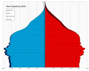 - Этнический состав: меланезийцы (канаки) — 39,1 % (105 088 чел.), белые (кальдоши, в основном французы) — 27,2 % (73 105 чел.), увеанцы и футунанцы — 8,2 % (22 038 чел.), полинезийцы — 2,1 % (5644 чел.), индонезийцы — 1,4 % (3763 чел.), вьетнамцы — 0,9 % (2418 чел.), ни-вануату — 1 % (2680 чел.), другие (потомки смешанных браков французов, арабов, азиатов) — 21 % (56 440 чел.). (Перепись 2014 года).