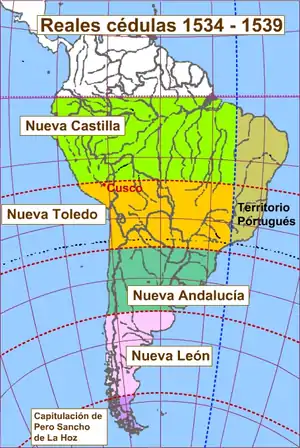 В мае 1534 года Карл I подписал четыре королевских грамоты, согласно которым граница Новой Кастилии отодвигалась на 70 лиг к югу, а на территориях южнее её образовывались губернаторства Новый Толедо, Новая Андалусия и Новый Леон; каждое из них с севера на юг простиралось на 200 лиг, а с запада на восток — от Тихого до Атлантического океана или до демаркационной линии, установленной по Тордесильясскому договору.