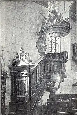 Кирха имела традиционную ориентировку по сторонам света. Высокая церковная башня была построена в 1685—1695 годах и достигала 84 метров. Кафедра изготовлена в 1848 году, а орган — в 1737 мастером Адамом Каспарини.