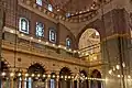 Окна украшены цветными витражами. На всех окнах имеются аяты и суры из Корана. Мечеть отделана фаянсом и имеет пять ворот, одни из которых выходят на передний двор мечети.