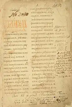 | Временникъ, еже есть нарицается лѣтописание князеи и земля Руския, и како избра Богъ страну нашу на послѣднѣе время, и грады почаша бывати по мѣстом, преже Новгородчкая волость и потом Кыевская, и о поставлении Киева, како во имя назвася Кыевъ[1] | |