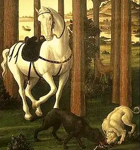 - Он [Настаджо] увидел бежавшую к месту, где он стоял, через рощу <…> восхитительную обнажённую девушку,<…> плакавшую и громко просившую о пощаде. Помимо этого он увидел по сторонам её двух огромных псов…