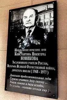 В 1995 году школе присвоено имя К. Н. Новикова[2]. 26 декабря 2016 года на стене здания школы в честь 100-летия со дня рождения К. Н. Новикова установлена мемориальная доска[7][8].