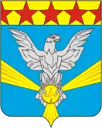 В описании герба говорится: «В лазоревом (синем, голубом) поле серебряный обернувшийся орёл с распростёртыми крыльями, держащий в лапах золотой безант с тремя вписанными, и, расходящимися наподобие вилообразного креста, лучами того же металла; и золотой главой, обременённой пятью червлёными звёздами о пяти лучах; две звезды по сторонам видны наполовину»[10].
