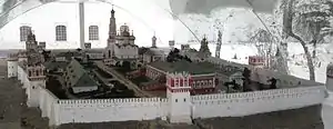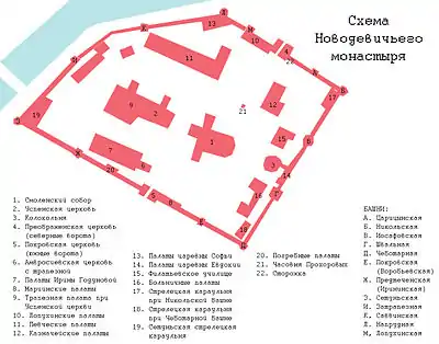 | Смоленский собор • Крепостные стены с башнями • Трапезная • Колокольня • Покровская надвратная церковь • Преображенская надвратная церковь • Амвросиевская церковь • Церковь Успения • Часовня Прохоровых • Палаты царевны Софьи • Палаты царицы И.Годуновой • Казначейские палаты • Лопухинские палаты • Певческие палаты • Мариинские палаты • Трапезная • Училище | |