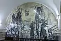 Между пилонами и сводом центрального зала, начиная от выхода в город, идёт гипсовый скульптурный фриз с фигурами солдат и офицеров Красной Армии, которые либо планируют операции либо непосредственно участвуют в боевой операции (скульпторы — А. Е. Зеленский, Н. В. Томский, С. Л. Рабинович, Н. М. Штамм). Среди них связисты, лётчики, танкисты, пехотинцы, морские пехотинцы, кавалеристы[16]. Скульптурные группы отделяются друг от друга орденами Великой Отечественной войны. Над выходом к эскалатору — щит с надписью «Слава доблестным бойцам Великой Отечественной войны»[16].