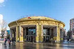 Станция имеет наземный вестибюль в уличном павильоне на Пятницкой улице между домами № 21 и 23. Он построен в виде массивной ротонды с мощным упрощённым куполом. Архитекторы вестибюля — В. Г. Гельфрейх, И. Е. Рожин при участии Г. С. Тосунова и Л. А. Шагуриной; инженер-конструктор — М. Семиз; скульптор — Г. И. Мотовилов[4]. Это первый в Москве павильон в форме ротонды с куполом и колоннадой по всему периметру. Позже такая конструкция станет типовой (вестибюли станций «Рижская», «Алексеевская», «ВДНХ» и «Университет» — его упрощённые копии)[5]. На месте наземного вестибюля раньше находилась церковь Параскевы Пятницы на Пятницкой, снесённая в 1934 году при подготовке проекта Генплана развития Москвы[6].