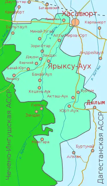 В целях более интенсивного хозяйственного и культурного развития чеченского населения, Указом Верховного Совета СССР от 5.10.1943 года, путём разукрупнения Хасавюртовского района, был создан моноэтнический — чеченский Ауховский район с центром в селе Ярыксу-Аух.