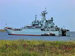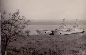 В итоге решением ЦК КПСС и СМ СССР Донузлав был передан Министерству обороны для создания Крымской военно-морской базы Черноморского флота, корабли которого должны были контролировать Средиземное море. Морскому пароходству достался участок занимающейся добычей песка из Донузлава[23]. С целью определения нового пункта базирования и создания запасного стратегического командного пункта флота в октябре 1965 года из грузинского Поти в Донузлав были передислоцированы первые военные корабли — МПК-8 и МПК-110 307-го дивизиона 20-й дивизии охраны водного района[24]. В январе 1966 года в Донузлав зашёл СДК-4, морской буксир и вспомогательные суда. Спустя полтора года, 14 августа 1967 года к ним присоединились десантные корабли «Воронежский комсомолец», «Крымский комсомолец», эскадренный миноносец «Буйный» и несколько СДК[25].
