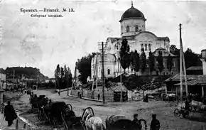 16 июля 1875 года в Брянске произошёл крупный пожар, уничтоживший значительную часть города (даже каменные строения получили серьёзные повреждения). Сгорел и обрушился деревянный купол возводимого собора, постройка которого близилась к завершению.[2] Однако уже в 1876 году был освящён правый придел — во имя Святителя и Чудотворца Николая, а в 1879 году — левый придел, во имя святого Великомученика Иоанна Воина; тогда же было устроено и отопление храма.