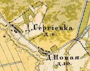 СЕРГИЕВКА — деревня, на земле Оккервильского сельского общества, при просёлочной дороге при р. Оккервиль 12 дворов, 35 м. п., 29 ж. п., всего 64 чел. (1896 год)[9]