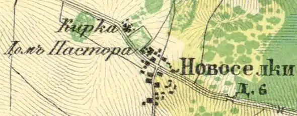 На карте Санкт-Петербургской губернии Ф. Ф. Шуберта 1834 года, упоминается деревня Новоселки и в ней Кирка и Дом Пастора[10].
