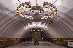 По центральной оси станции подвешены семь люстр кольцевой формы. Внутри колец ранее были расположены трубчато-ленточные построения из анодированного алюминия, символизировавшие знамёна.