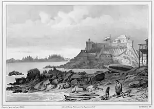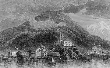 ![]() Ново-Архангельск на акварели, подписанной «креолом Александром Ольгиным 20 июля 1837 года» | |