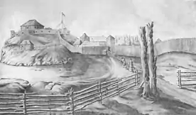 на горе красуется довольно большое двухэтажное деревянное здание: дом главного правителя колонии с батареею.