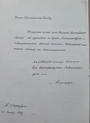 Указом архиепископа Тобольского Варлаама от 17 января 1799 года женщинам было официально дозволено жить при церкви[3]. Этим решением богадельня получила статус. Указ Варлаама предписывал Екатеринбургскому духовному правлению следить, чтобы в доме при церкви позволялось жить лишь «немалолетним вдовам и девицам, и сверх того не чуждающимся церкви святой»[3].