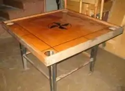 Для изготовления столов используется настоящая древесина: стол — это фанера толщиной не менее 9 мм для стандартных столов и не менее 15 мм для профессиональных; борт — это бессучковая берёза, бук или другое дерево, имеющее схожие свойства. Бортики должны быть соединены пазами и иметь паз для полотна фанеры. Именно пазовое соединение и боковой паз для фанеры позволяет столу быть прочной несущей конструкцией. Столы покрываются специальным лаком в несколько слоёв — не менее трёх.