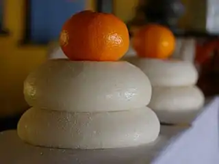 Трудно представить новогодний японский стол без моти (яп. 餅) — десерта из клейких сортов риса (яп. 餅米 мотигомэ). Моти на Новый год — это пожелание процветания, богатства и доброго урожая в следующем году. С древности круглые моти ассоциировались с круглыми зеркалами — обязательными атрибутами богини Аматэрасу[2].
