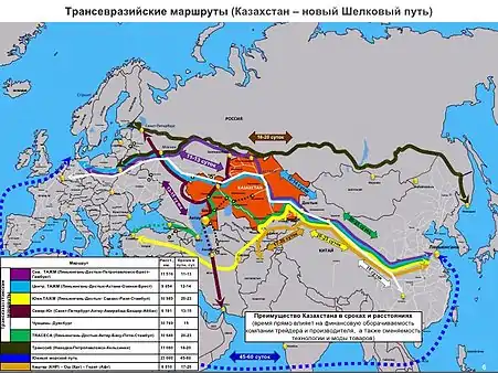 В сухопутной части «Нового Шёлкового пути» предполагается строительство трёх железнодорожных коридоров. Северный коридор пройдёт через территорию России, а центральный и южный — через территорию Центральной и Средней Азии, в том числе через Казахстан, входящий вместе с Россией в Евразийский экономический союз. Впоследствии железнодорожные коридоры будут дополнены автомобильными.
