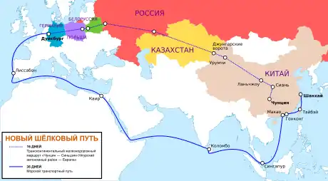 Транспортный маршрут включает трансконтинентальную железную дорогу — Транссибирскую магистраль, которая проходит через Россию и второй Евразийский континентальный мост, проходящий через Казахстан[1]. Поезда по этому самому длинному в мире грузовому железнодорожному маршруту из Китая в Германию будут идти 15 дней, что в 2 раза быстрее, чем по морскому маршруту через Суэцкий канал[2].