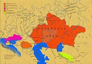 Первым государственным образованием ногайцев была Ногайская Орда, появившаяся в результате распада Золотой Орды[97][98][99] — последняя из великих держав кочевников, которое оказало сильное влияние на историю почти всех современных тюркских народов современной России и соседних стран. Государствообразующим титульным населением Ногайской Орды были ногайцы — конгломерат народов и родовых объединений, живших от Дуная до Иртыша, которые в военно-политическом союзе выделились в родовую стратификацию. В основе это рода кыпчако-половецкого, узо-печенежского и алано-асского круга. Ногайская Орда привлекала, иногда и удерживала, в составе своего государства и другие этносы — ясак, что складывало Ногайскую Орду в конфедерацию[100]. Происхождение ногайской государственности традиционно связывают с именем золотоордынского темника Ногая. Возглавляя более пятидесяти лет войско Золотой Орды, Ногай прослыл незаурядным полководцем: был победителем армии хулагуидов Ирана, совершил походы на европейские государства, вассальную зависимость от него признавали владения Византии, Сербии и Болгарии. Ногай был настолько влиятельным, что многие его современники и ряд известных ученых считали его легитимным правителем Золотой Орды[101]. Исторические документы свидетельствуют о том, что под его широким влиянием были: страны Ближнего Востока, Северный Кавказ и Закавказье, Подонье, западнорусские земли, Болгария, Сербия, Венгрия, Румыния, Польша, Прибалтика и близкий к ставке Крым[102]. В его непосредственном владении был улус, располагавшийся на территории от Дона до Дуная, который он обособил от Золотой Орды[103]. Некоторые историки[104][105][106][107][108][30] склонны считать, что именно улус Ногая дал начало Ногайской орде в междуречье рек Эмбы и Урала.
