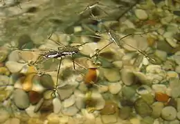 Жук-плавунец Dytiscus marginalis. Задние ноги жуков — плавунцов, водолюбов, вертячек, клопов гладыша называют плавательными. Их голень и членики задних лапок плоские, покрыты гребешками эластичных волосков. Нога напоминает весло или рыбий плавник[4] |