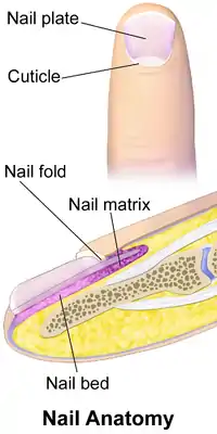 Ноготь состоит из ногтевой пластины, матрицы ногтя и ногтевого ложа под ней, а также окружающих его складок[5]. Передний край ногтевой пластинки свободен, задний и боковые края окружены кожной складкой. Верхняя часть кожной складки надвигается на ногтевую пластинку и носит название проксимальный валик (эпонихий[6]), который выполняет защитную роль, не давая инородным телам и бактериям проникнуть к ростковой зоне ногтя. Край валика представляет собой ороговевшие клетки. Высыхая, а затем отслаиваясь, этот край даёт начало заусеницам.